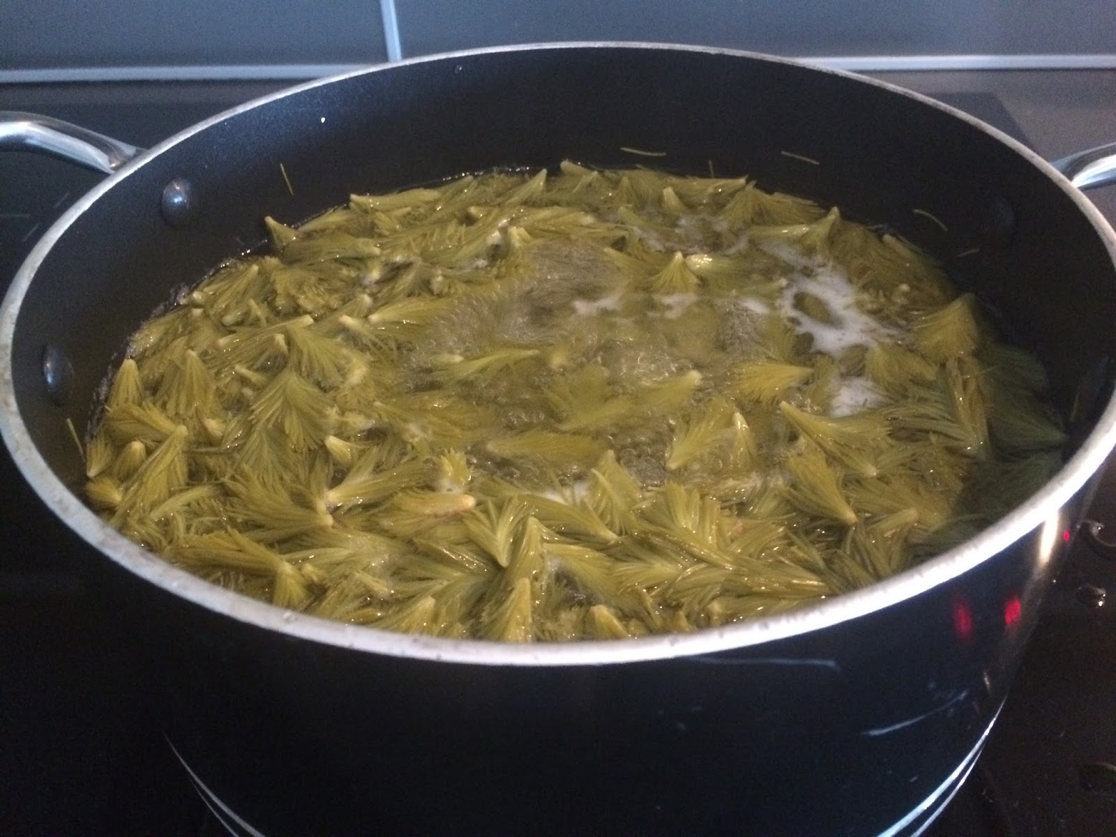 Deretter silte jeg av granskuddene. Jeg helte først gjennom en sil og deretter gjennom et klede for å forsikre meg om at det ikke var noen nåler igjen i granskuddsaften. Så kokte jeg væsken opp igjen sammen med sukker: 3 deler væske og 2 deler sukker (dersom det er 15 dl væske så bruker du 10 dl sukker). La dettte koke på middels varme til det begynner å tykne. Det tar tid... Sirupen endrer farge til rødt mens den koker. Jo lengre blandingen koker - jo dypere blir rødfargen. Jeg lot blandingen koke i litt over 2 timer - men det er mulig at det var litt lenge. Fargen ble veldig dyp - men sirupkonsisen ble fin. Neste gang skal jeg prøve å koke det litt kortere for å se om jeg kan beholde mer av den flotte rødfargen.